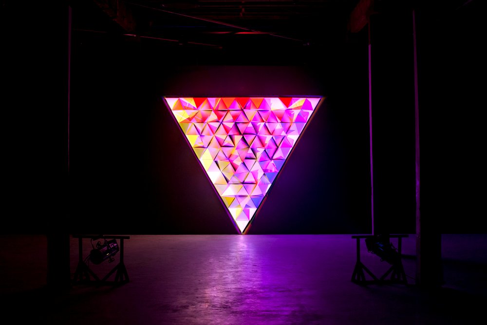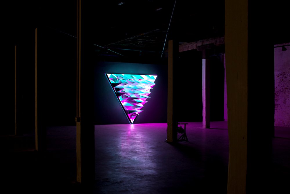 A new exploration in colour and light. Primary is a three sided wall installation which is illuminated by three LED light sources. This is a reference to the primary colours of light, red, green and blue (RGB). These base colours of light have defined the quantity of light sources and the use of triangles. Everything in threes. The cardboard structure is designed to fragment the light and show how coloured light is mixed. Light and object are intrinsically connected.