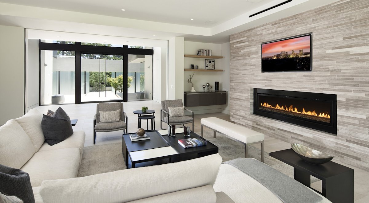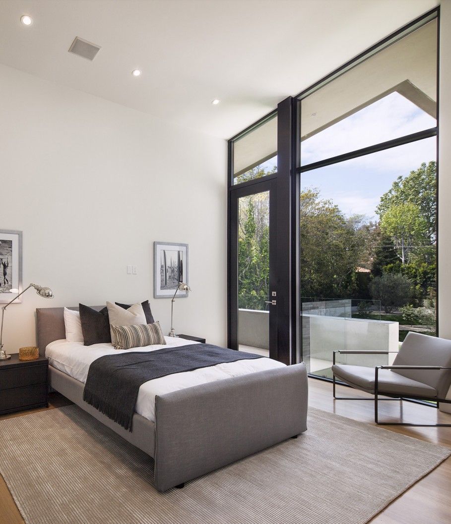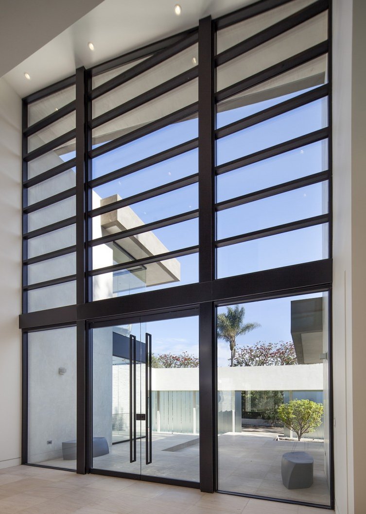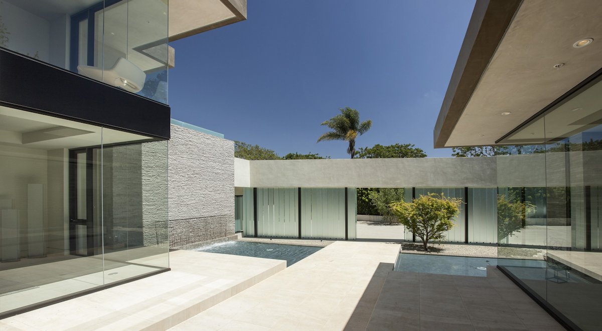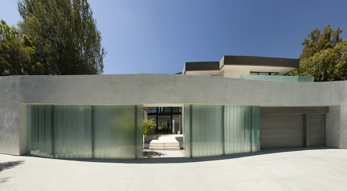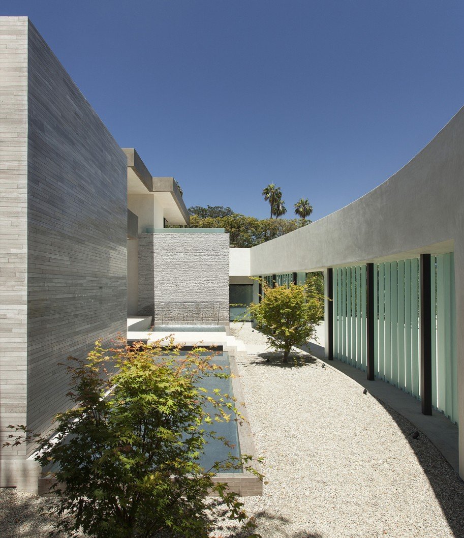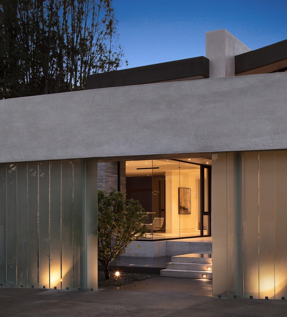 Designed for a family with three small girls this house needed to respond to the busy street it is located on. We came up with a sequence of entry which uses several devices to separate the occupants from the noise beyond. The drive court is screened from the street by high gates and tall landscaped elements. This area connects to an inner courtyard through a curving glass screen designed to allow the light to pass through but shield from the cars and noise. The courtyard contains a waterfall and an infinity edge pool both of which help to instill a feeling of calm as you approach the house. Our hope is by the time you enter into the two story entry hall you have left the rest of the world behind. The L shaped plan of the house maximizes the expansive back yard while further screening potential noise such that the rear yard is extremely quiet and peaceful. The garden also contains a pool and guest house.