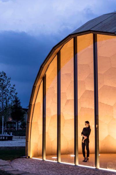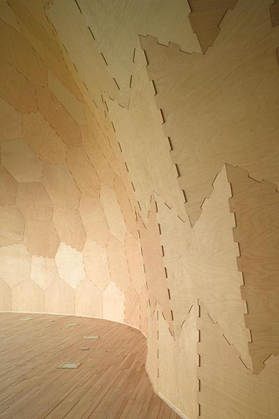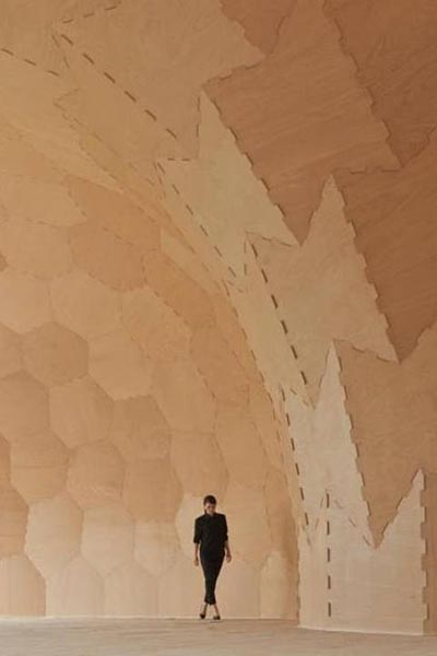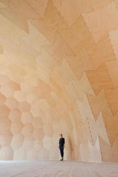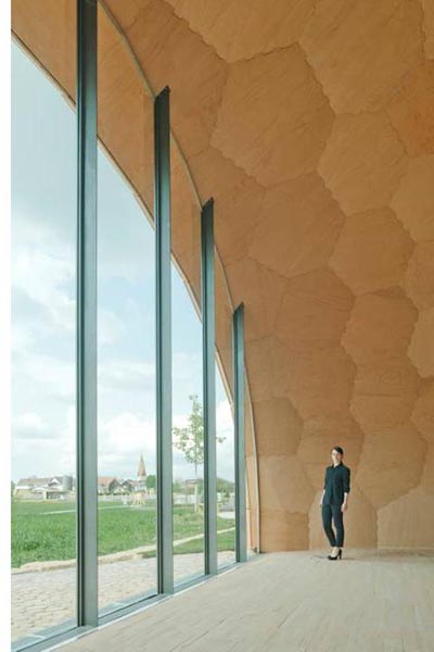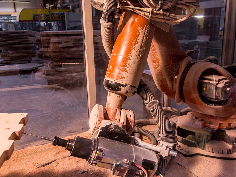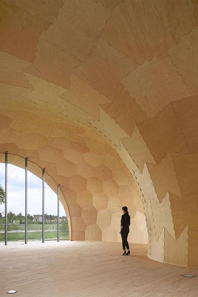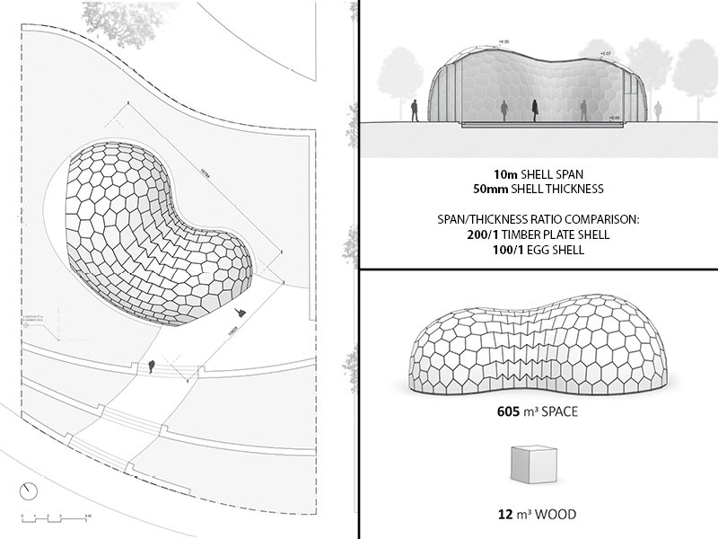 The Landesgartenschau Exhibition Hall is an architectural prototype building and a showcase for the current developments in computational design and robotic fabrication for lightweight timber construction. Funded by the European Union and the state of Baden-Württemberg, the building is the first to have its primary structure entirely made of robotically prefabricated beech plywood plates. The newly developed timber construction offers not only innovative architectural possibilities; it is also highly resource efficient, with the load bearing plate structure being just 50mm thin. This is made possible through integrative computational design, simulation, fabrication and surveying methods.